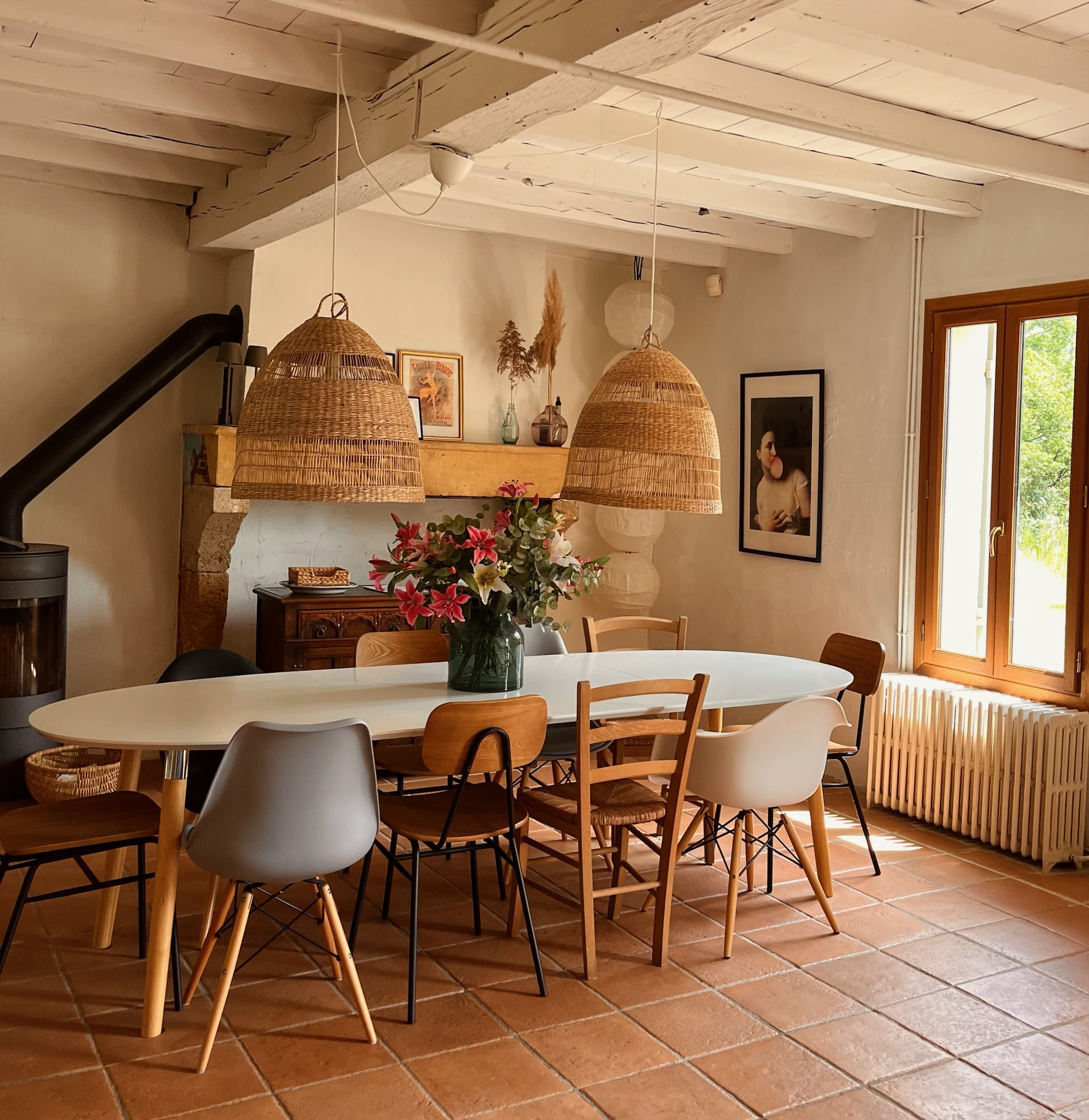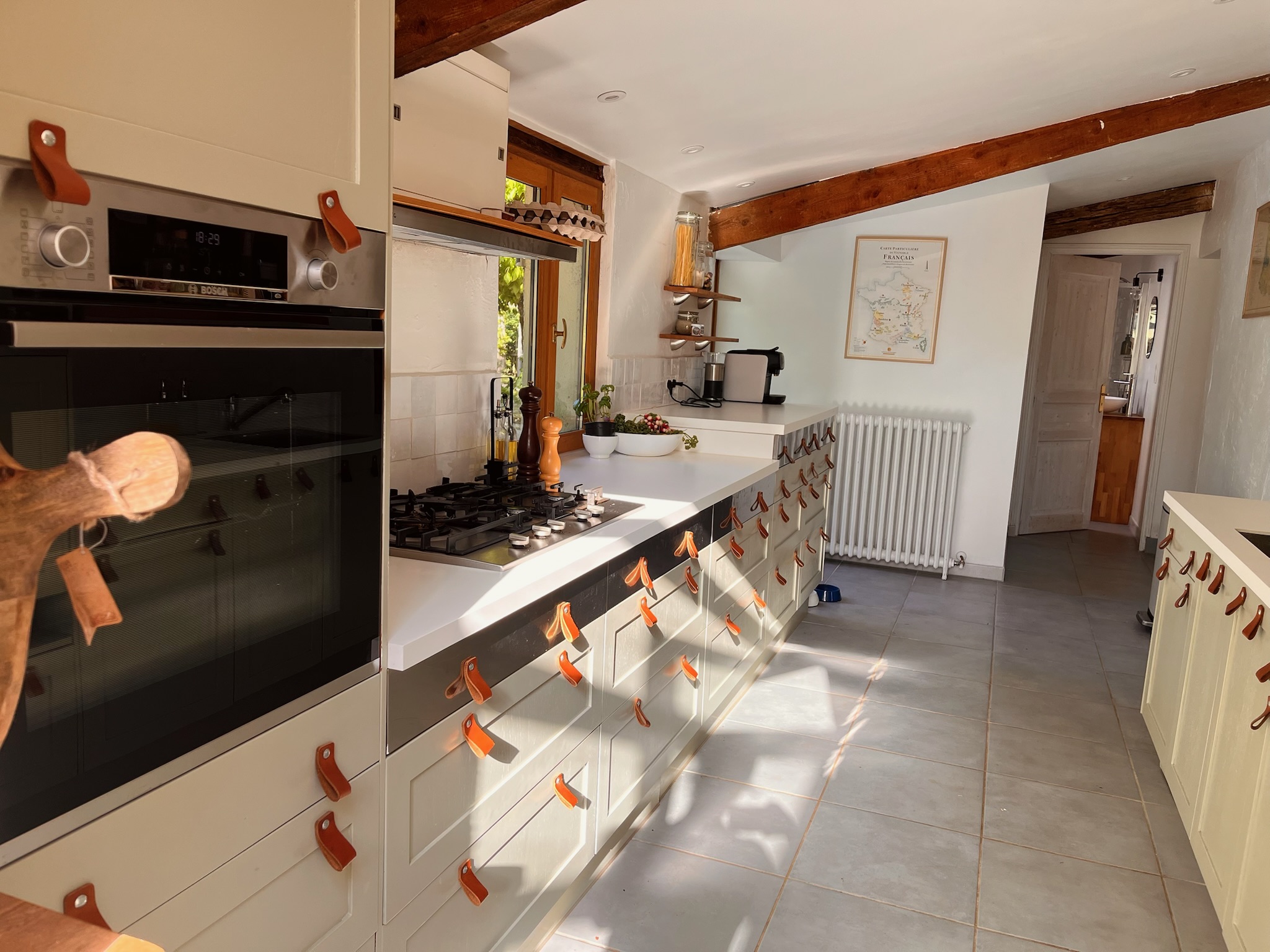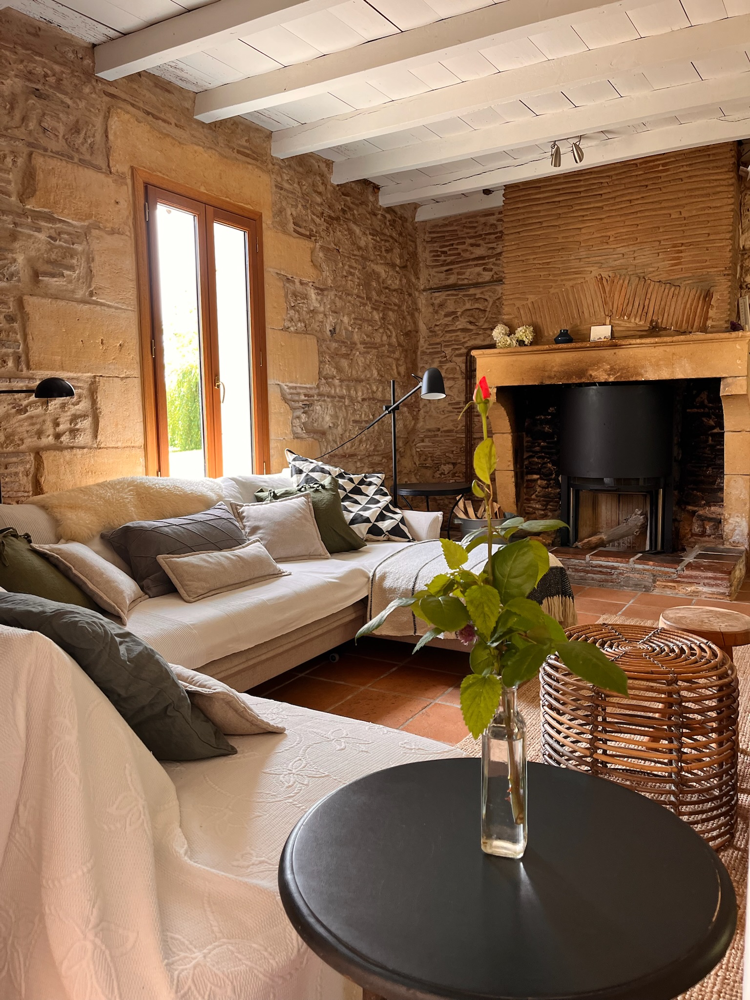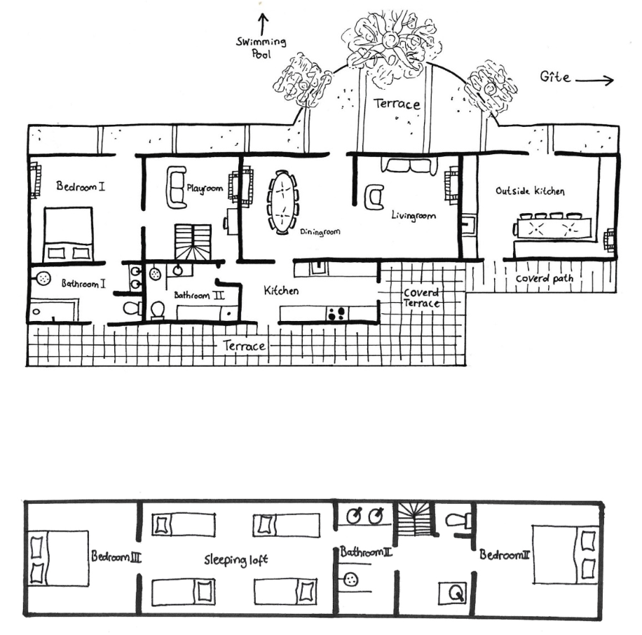 The ground floor in the main house consists of a large sitting and dining area where, when the weather is cold you can sit by the woodburner and in the summer you can find the coolness of an old building. The kitchen is fully equipped with a gas stove, an oven and a dishwasher and coffee machine.