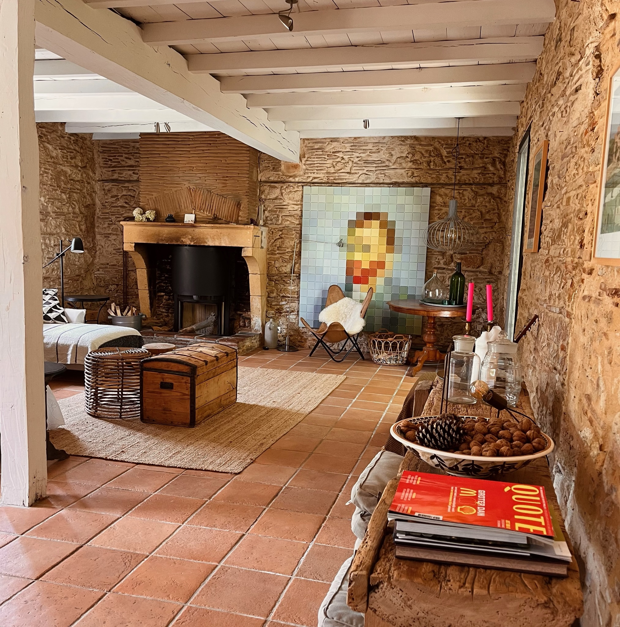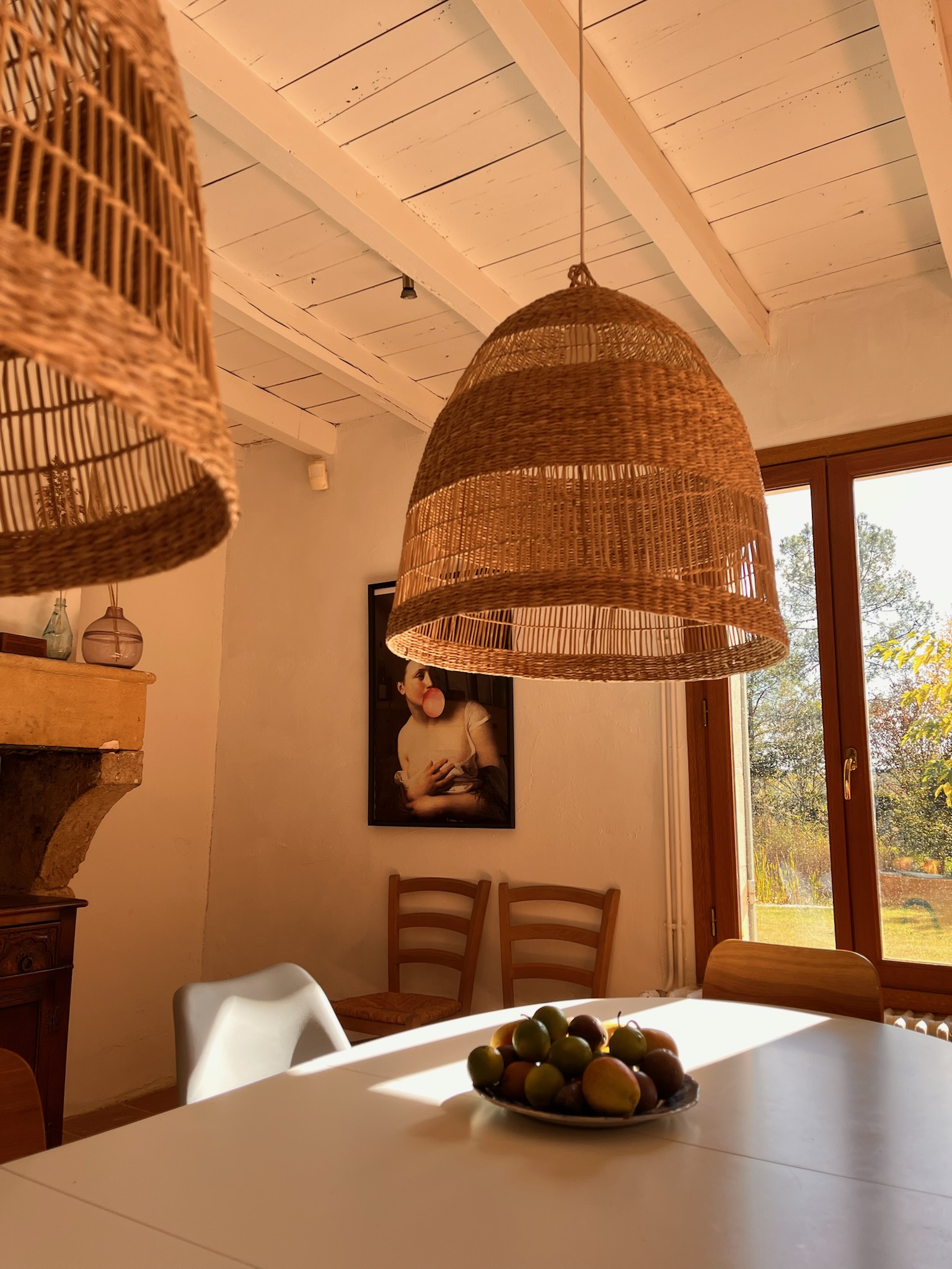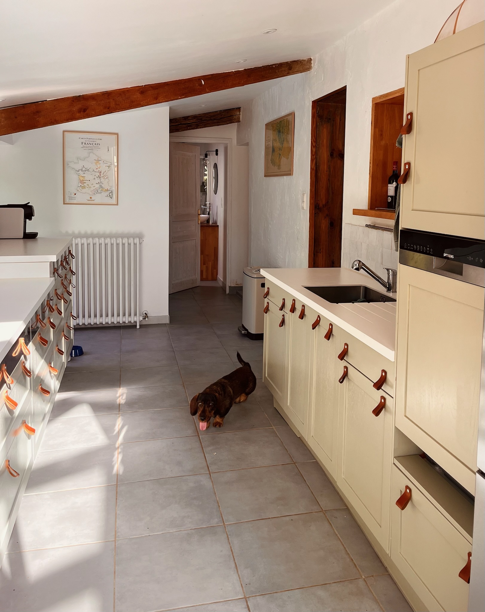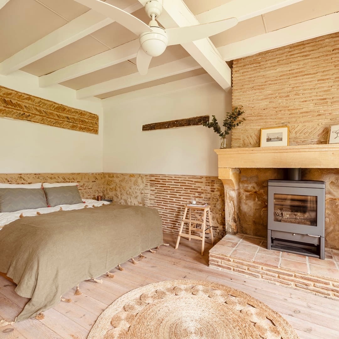 The ground floor in the main house consists of a large sitting and dining area where, when the weather is cold you can sit by the woodburner and in the summer you can find the coolness of an old building. The kitchen is fully equipped with a gas stove, an oven and a dishwasher and coffee machine.