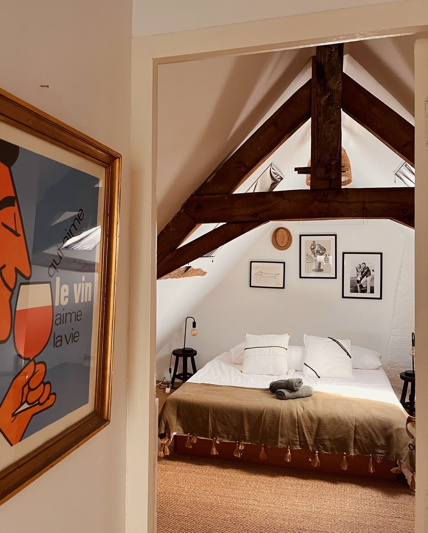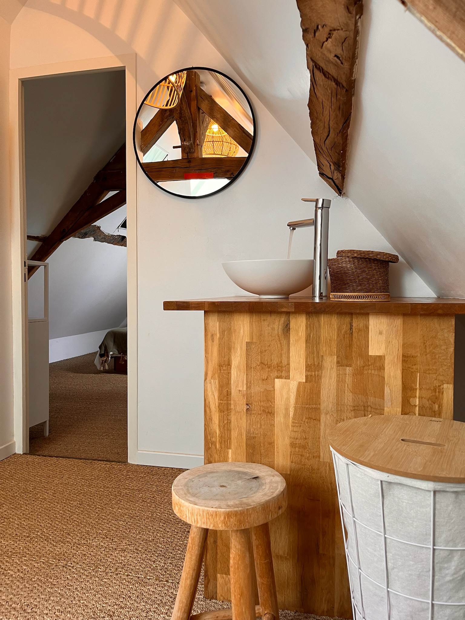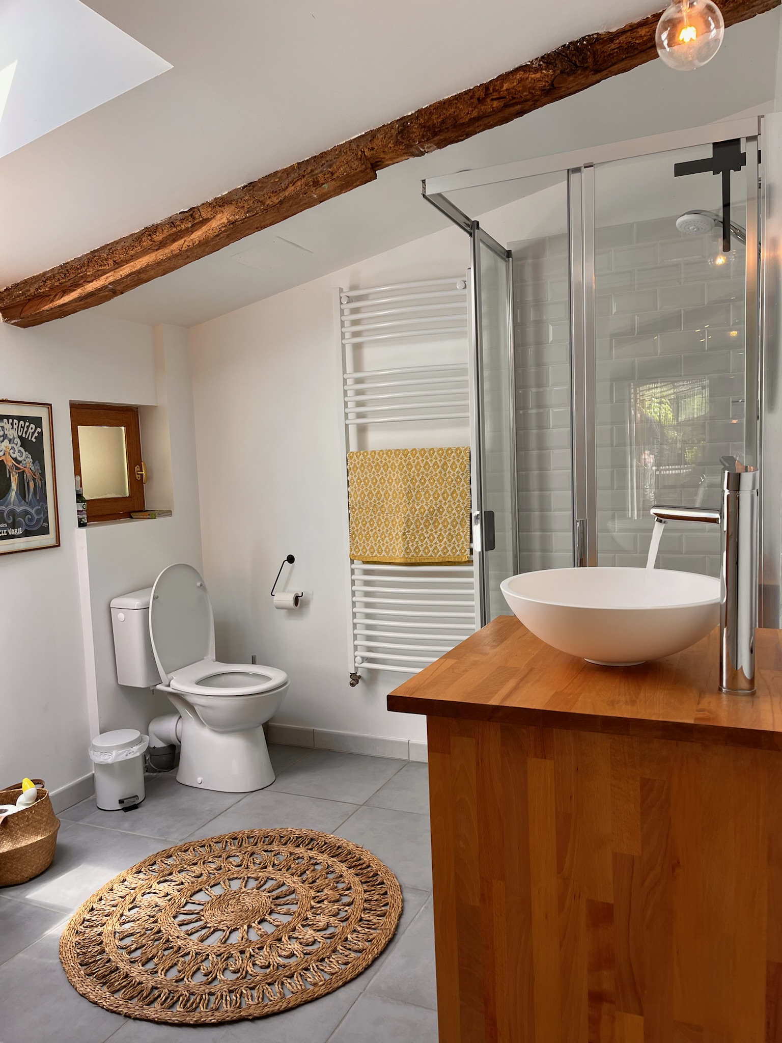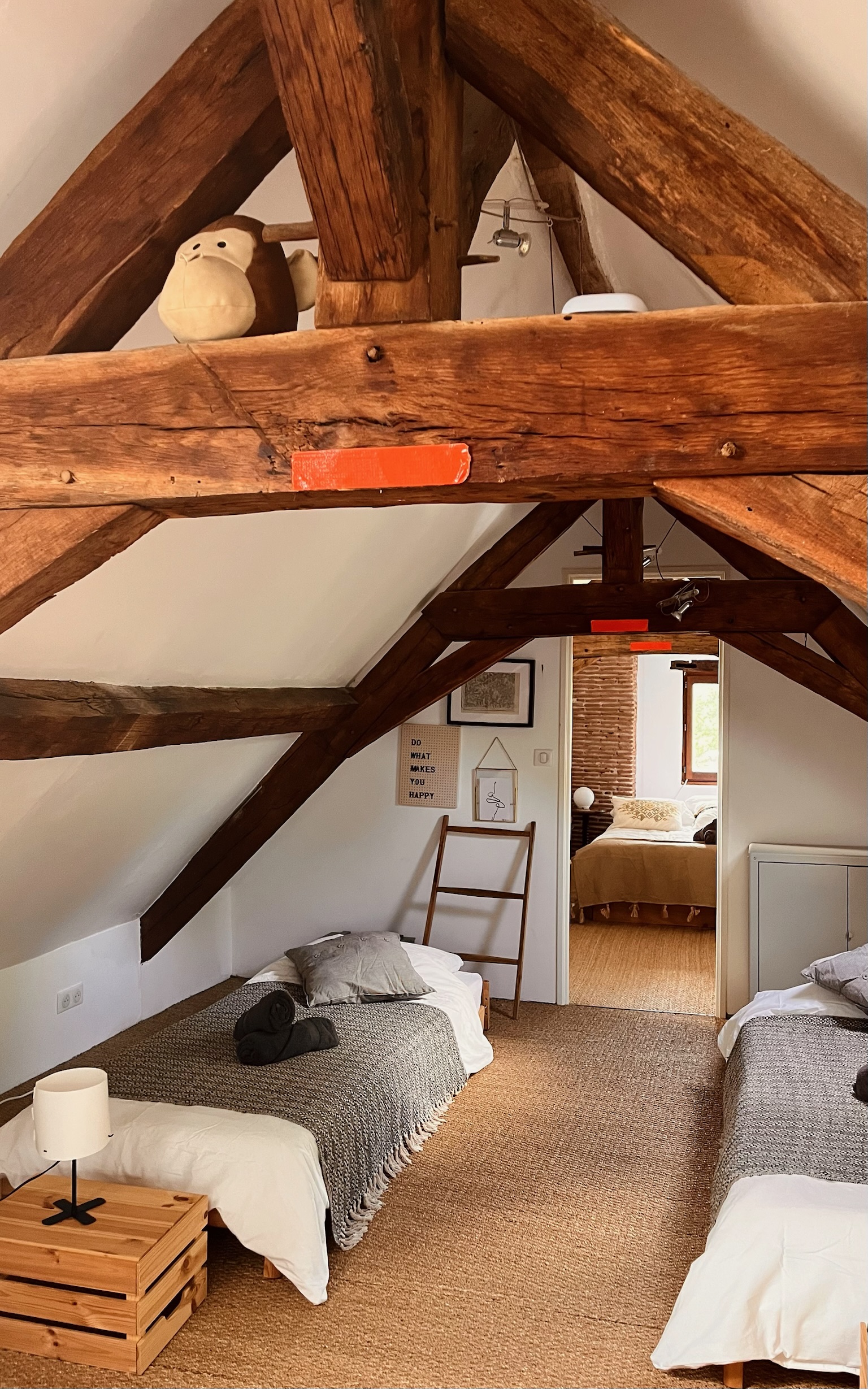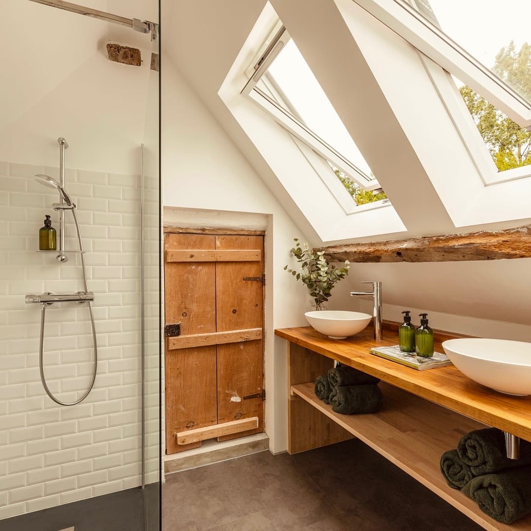 In the downstairs bathroom adjacent to the kitchen is a shower, toilet, washbasin and you can find a washer and dryer. In the playroom you can find books and games and a TV with a Google Chromecast you can use. In this room the stairs lead to the attic and a door that gives access to the master suite downstairs, a double bedroom with bathroom with a double sink, a bath, a toilet and a shower.
