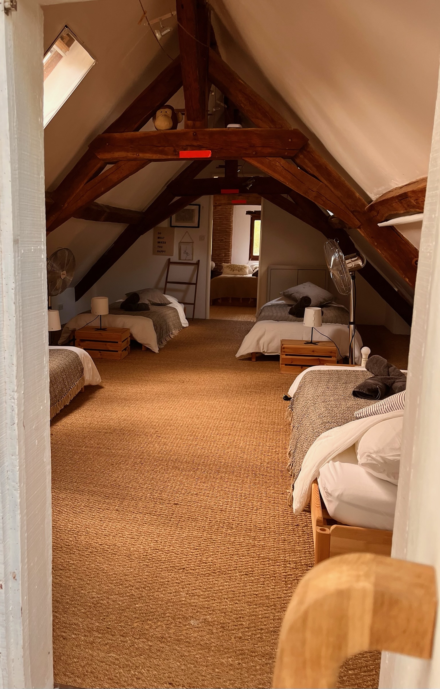 Coming up the stairs on the left side is a toilet and the door to a double bedroom. On the right hand side is a bathroom with double sink and shower and coming through there you have a large bedroom with four single beds. Through that room is the next bedroom with a double bed.
